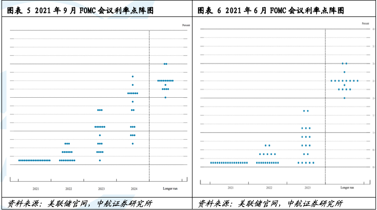 此外,9月议息会议中,加息节奏相较6月预期明显加快,向市场释放了鹰派信号。目前利率点阵图显示,半数美联储官员(9位)预计最早在明年开始上调联邦基金利率,较6月会议中支持明年启动加息的官员增加了2位。目前,有9位委员预计将在2022年加息,17位委员预计将在2023年加息,至2024年共加息6-7次,加息节奏相较6月预期明显加快,向市场释放了鹰派信号。同时,鲍威尔强调,Delta变种的增加可能对本季度的经济增长产生了负面影响,而供应链中断可能继续推动通胀压力。如果后期通胀持续走高,美联储有望以较快的速度推动货币政策收紧。因此,未来需警惕美联储加息进程进一步加快的可能。美联储货币政策周期上领先于欧央行和日本央行,这将有助于推动美元指数走强。