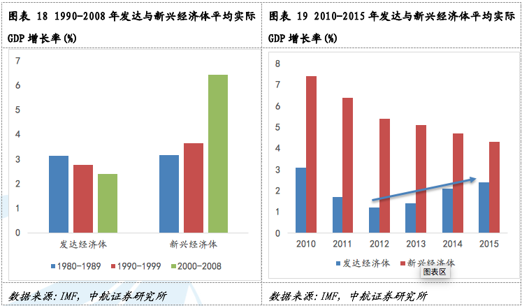 从2000年到2008年,新兴市场的增长率异乎寻常地高。2000-2008年间,新兴经济体的年平均增长率为6.4%,而发达经济体的年平均增长率为2.4%。强劲增长吸引了资金的流入。