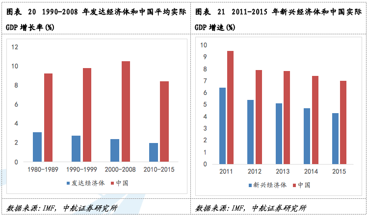 相较于其他新兴经济体,我国一直保持着高速的经济增长。2010-2015年间,尽管我国经济增速放缓,但下降幅度不及新兴经济体整体水平。2010-2015年我国GDP增速年平均下滑7%,低于新兴经济体整体的10%。