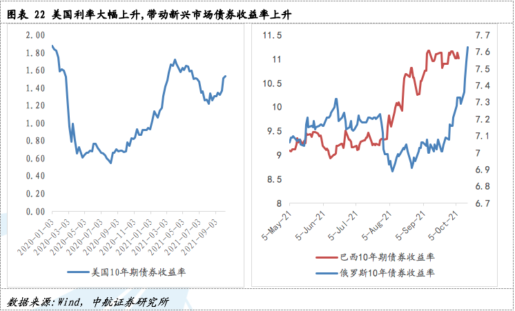 我们预测,随着冬季临近,整体用电需求将提升,而供给的恢复需要时间,因此能源价格预计将继续保持高位。能源价格以及多种大宗品的上涨将推动市场通胀预期,或将带动美国长期债券收益率的继续走高。