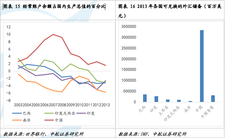 2013年,受美国货币政策冲击严重的新兴经济体当时都存在着巨额经常账户赤字。2003-2013年间,“脆弱五国”的经常账户赤字均出现了迅速的增长。平均经常账户赤字占GDP比重在2%-6%之间。巨额经常账户赤字意味着各国依赖外国投资为其大量经济活动提供资金,其风险为资本流入的“突然停止”。2013年,随着美国资产的潜在回报增加,资金从这些国家中大规模流出,由于能够降低资本流动极端变动敏感性的储备余额较低,缺乏对汇率波动的抵御能力,对各国货币需求的下降导致汇率的大幅贬值。