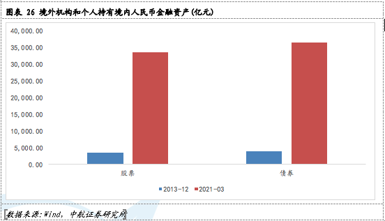 美国去年在对抗Covid-19的糟糕表现推动国际资本向中国方向流动。作为2020年世界上唯一一个取得正增长的主要经济体,中国的吸引力显而易见。而在此期间,我国金融市场的开放为外资的流入提供了便利,外资流入境内股票、债券市场的规模大幅提高。根据EPFR的数据,从全球来看,2020年第四季度以及2021年第一季度,美国和中国股票基金是吸引国际投资者资金流入最多的两个地区。