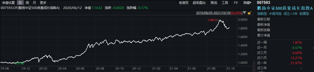 鹏扬中证500质量成长指数A(007593)近6月收益率15.74%,近一年收益率27.54%,成立以来收益率84.41%,截至2021年9月30日