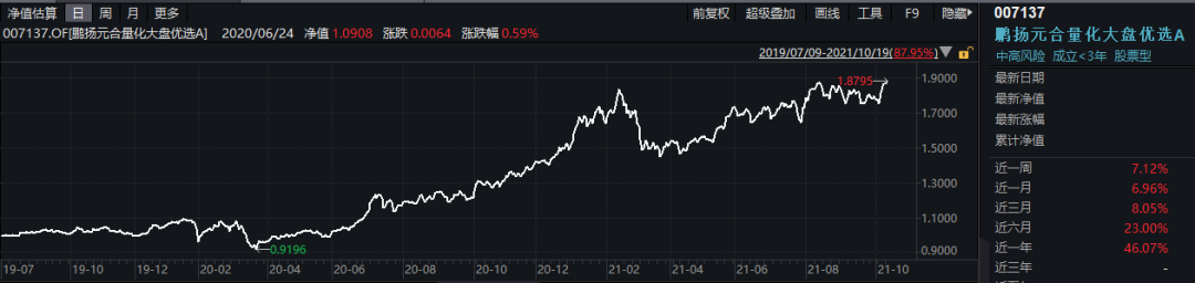 鹏扬元合量化大盘优选A(007137)近6月收益率25.7%,近一年收益率43.85%,成立以来收益率84.41%,截至2021年10月18日