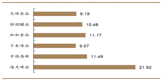 通过同行数据对比发现,同业对比人均效益(包含人均收入、人均利润两项指标),海天领先中炬、千禾、加加、天味、恒顺,我们计算得出海天人均创收约为其他调味品企业的3-5倍,而人均创利可高达5-10倍。