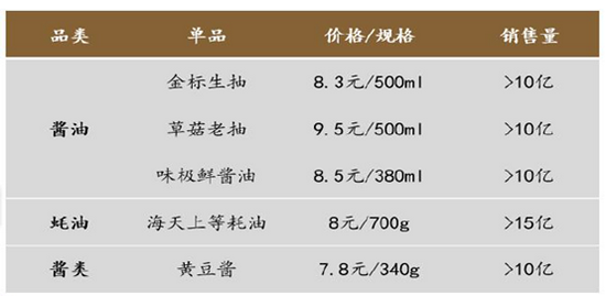 海天味业的大单品策略无疑也是成功的。根据相关统计,海天的五大单品横跨三大品类,其中酱油品类有金标生抽、草菇老抽、味极鲜酱油三大单品,销量都在 10 亿级别;蚝油品类有海天上等蚝油,销量在15亿级别;调味酱品类的黄豆酱单品销量在 10 亿级别。