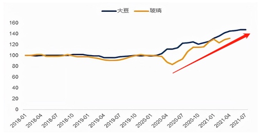 资料显示,大豆2020年中低点至今,上涨了近50%;豆粕、玻璃的价格相比2020年年初分别增长30.69%、64.66%;塑料、纸浆等原材料价格同比上涨了20%。