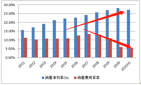 当渠道建立后,多品类扩张往往效率最佳。我们通过海天的财务数据得到验证,在渠道复用下,海天的相关费率呈现下降趋势,但是利润率却出现持续上升态势。如下图: