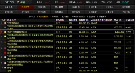 酒鬼酒的前十大流通股东中,香港中央结算公司三季度持股减少了113.9万股,变动比例下降8.9%。