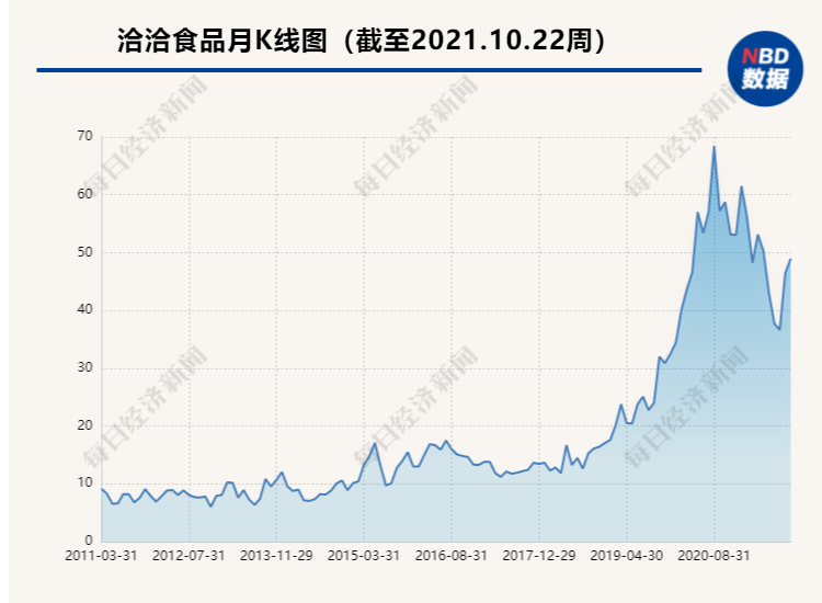 股价方面,从2018年到2020年,洽洽食品从16元涨至最高70元附近,三年涨幅超过340%,而进入2021年股价则一度腰斩,最低跌至35.8元。
