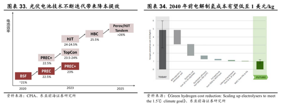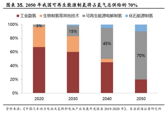 一方面,随着未来HJT、TopCon等技术产业化发展,光伏等可再生能源的发电成本有望持续下降;另一方面,电解设备的技术进步以及规模化发展带动成本下降,从而推动绿氢生产成本的进一步下行。根据IRENA的预测,在2040年前电解水制氢成本将低至1美元/kg(约0.54元/Nm3)。按照目前的发展趋势,我国近期将以工业副产氢为主,中长期以可再生能源电力制氢为发展方向,到2050年可再生能源电解制氢将占我国氢气供给的70%。