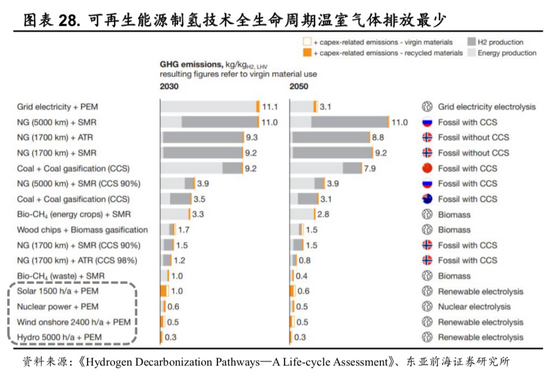 CCUS技术降低制氢碳排放,但增加制氢成本。碳捕获、利用与封存(CCUS)技术能够有效降低化石燃料制氢过程中的碳排放问题。根据《煤制氢与天然气制氢成本分析及发展建议》一文测算,煤制氢的成本为12元/kg,天然气制氢成本为13.2元/kg。2019年我国CCUS技术在煤制氢的过程中需要约7元/kg的成本,因此最终制氢成本为19元/kg,增加约60%;天然气的最终制氢成本在17.6元/kg,增加约33%。因此化石燃料制氢的发展很大程度取决于CCUS技术的规模化与成本下降。