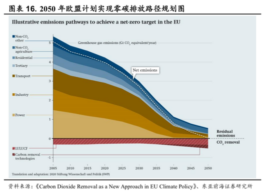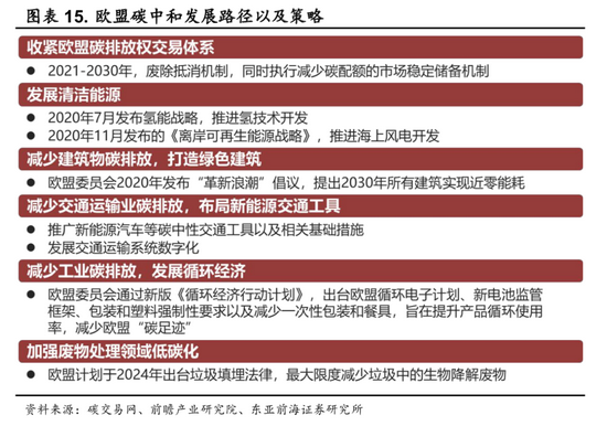 欧盟已实现碳达峰,发展氢能助力碳中和。欧盟整体已于1990 年实现碳达峰。2020年欧盟发布《欧盟能源系统整合策略》和《欧盟氢能战略》,计划未来10年向氢能产业投入数千亿欧元,紧密结合“下一代欧盟”复苏计划和《欧洲绿色协议》,目标是2050年实现碳中和。欧盟研究制定了碳中和背景下的产业政策,具体发展路径及策略包括收紧碳交易市场、发展清洁能源、打造绿色建筑、布局新能源交通工具等。
