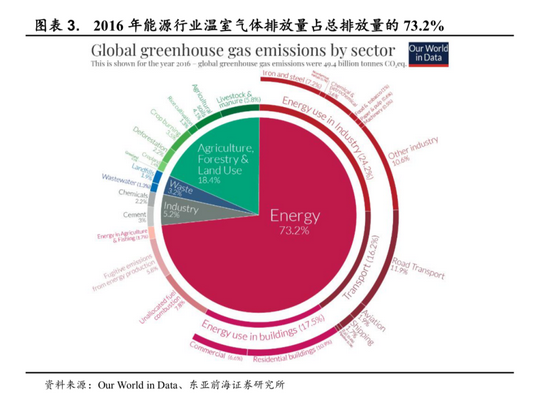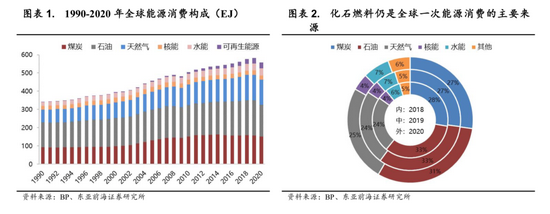 化石能源为目前全球能源消费的主要来源。根据BP世界能源统计年鉴,2020年全球一次能源消费总量为556.64EJ(1EJ=1018J),煤炭、石油、天然气等化石能源仍是当前全球能源消费的主要构成,累计消费占比达71.3%;可再生能源消费总量为31.71EJ,消费占比从1990年的0.04%提升至5.4%,并呈现逐年增长态势。根据世界资源研究所统计,2016年全球温室气体排放量为494亿吨二氧化碳当量,其中73.2%来自于能源部门。在全球碳中和大背景下,节能减排大势所趋。