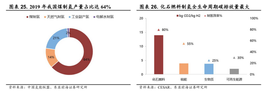 根据IEA的统计数据,2019年全球天然气制氢比例75%左右,煤炭制氢占15%。不同于全球天然气制氢占主导地位,我国煤制氢为首要的氢气来源,根据中国氢能联盟的数据,2019年我国氢气产量3342万吨,其中煤制氢占比达到64%,电解水制氢仅占2%左右。煤制氢的优点在于原料丰富、成本低廉、制氢效率更高,但化石燃料制氢其生命周期内的碳排放量远高于其他制氢方式。我国在化石燃料制氢方面碳排放量大,与发展清洁低碳的氢能源存在一定矛盾。