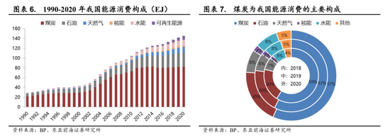2)能源结构需改善,对化石燃料依赖较大。2020年中国一次能源消费总量为145.46EJ,其中煤炭、石油、天然气消费占比分别为57%、20%和8%;我国煤炭产量占全球的50.7%,消费量占全球煤炭消费的54.3%,体现我国能源结构对化石燃料依赖程度较高,能源结构亟待改善。随着我国政府积极降碳减排,煤炭正逐步被污染物排放量相对更少的化石能源所替代,消费占比从1990年的77%下降至2020年的57%。