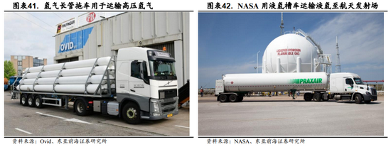 目前氢气运输主要有气氢拖车、液氢槽车以及氢气管道三种方式运输。国内普遍采用氢气拖车进行运输,气氢拖车运输节省了液化成本和管道运输的前期投资成本,在一定储运距离内经济性较高,比较适用于运输距离较近、输送量较低、氢气日用量为吨的用户端。液态氢运输主要利用液氢槽车,液氢的单车运氢能力是气氢的10倍以上,运输效率提高,综合成本降低。但现有技术条件下,液化过程能耗和固定投资较大,液化过程的成本占到整个液氢储运环节的90%以上。随着未来液化设备规模效应和技术升级,液化能耗和设备成本有较大下降空间。
