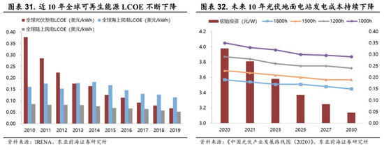 新能源发电成本快速降低,为生产低成本绿氢提供途径。全球可再生能源的平准化度电成本(LCOE)在不断降低,其中光伏发电LCOE从2010年的0.378美元/kWh降低至2019年的0.068美元/kWh,降本幅度为82%,海上风电与陆上风电的降本幅度分别为29%和38%。根据《中国光伏产业发展路线图(2020)》的测算,2030年我国地面光伏电站在1800小时等效利用小时数的LCOE为0.14元/kWh,此电费下制氢成本将低至1元/Nm3,降本空间为77%。