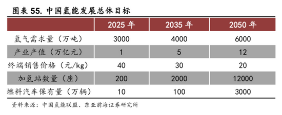 氢能:能源转型的未来方向。氢能具有环保低碳、高能量密度、蕴藏丰富等多方面优势。在全球“碳中和”的大背景下,美国、欧盟与日本等国家地区将氢能视为重要发展方向。目前我国能源存在相对短缺及化石能源对外依存度较高问题,能源结构亟待从化石燃料为主导向清洁能源转型。氢能配合光伏和风电等可再生能源的发展,成为未来能源消费深度脱碳、保障能源安全的重要环节。预计2050年氢能产值将达12万亿。