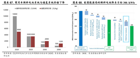 规模效应带来的成本下降是氢燃料电池市场化的重要因素。氢燃料电池汽车现阶段仍然依赖于政府补助以及政策支持,根据《氢燃料电池汽车全生命周期经济性分析2020》的研究结果,目前商用车燃料电池系统的价格国内行业平均水平在1万元/kW,商用车用储氢系统的国内平均水平在5000元/kg。随着未来质子交换膜燃料电池技术突破与规模效应带来的成本下降,燃料电池重卡、乘用车等车型的市场化进程将加速。商用车燃料电池价格至2025、2035、2050年分别降至3500、1000、500元/kW,商用储氢系统价格分别降至3500、2000、1200元/kg。
