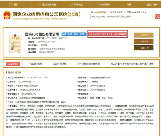 记者查询国家企业信用信息公示系统发现,药材股份的确已被标注了“该企业被列入经营异常名录”的提示。