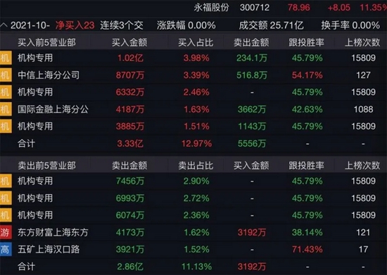 深交所2021年10月25日交易公开信息显示,永福股份因日收盘价涨幅达20.00%登上龙虎榜。买入前五名全部为机构席位,净买入额达13358万元,占当天总成交比例的15.51%。卖出前五名营业部合计净卖出5297万元。