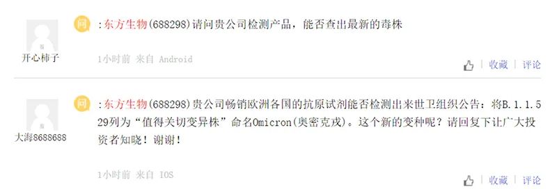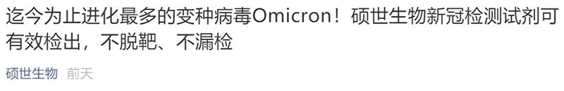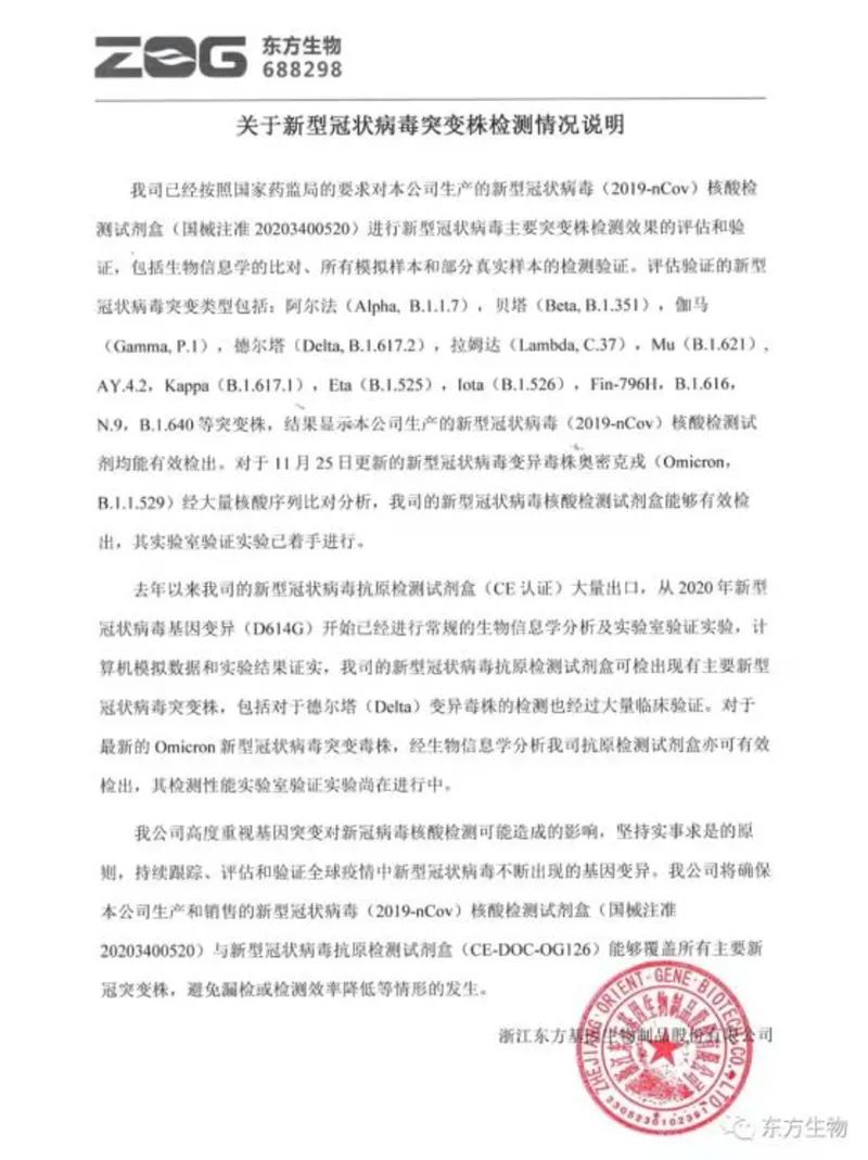 事实上,东方生物11月28日就在微信公众号上发布声明,对于新冠病毒奥密克戎,经大量核酸序列对比,公司的新型冠状病毒核酸检测试剂盒能够有效检出,其实验室验证实验已着手进行。