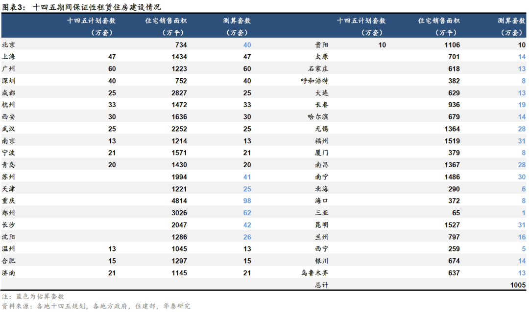 我们以住建部关注的40个重要城市作为测算对象,基于部分城市已公布的筹建数据,再结合住宅销售面积推断数据缺失城市,加总得到“十四五”期间40城建设保障性租赁住房约1005万套,参照国务院提法“以建筑面积不超过70平方米为主”,测算建筑面积约7亿平方米。