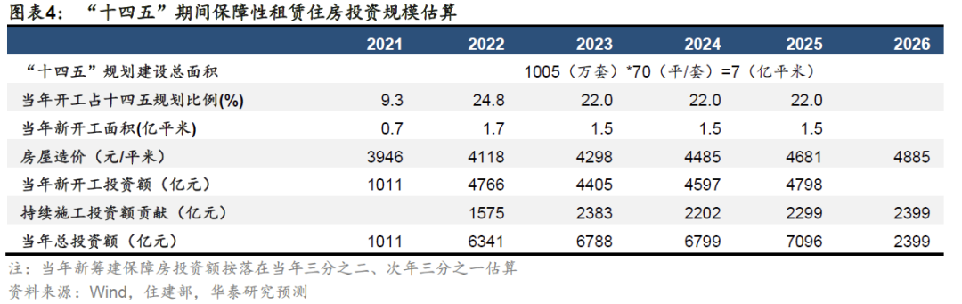 2)考虑到房地产建设存在1-2年的施工期,我们假设当年新筹建面积对应投资落在当年三分之二、次年三分之一。考虑到今年6月份国办发布指导文件、地方推进建设时点偏后,所以我们三分之二投资落在当年的假设将从2022开始。