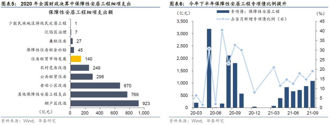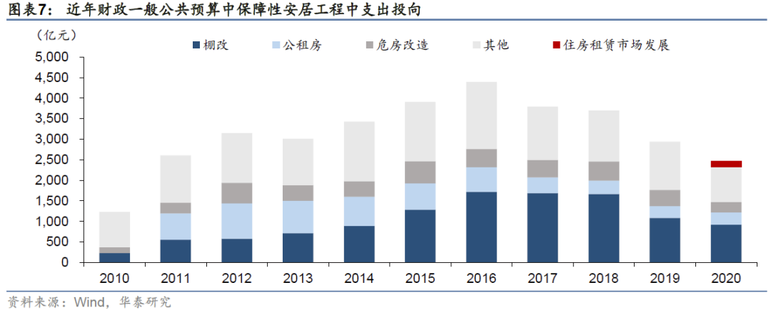 2)政府性基金预算中,主要为保障性安居工程专项债支出,2020年曾达到8221亿元,其中棚改专项债占比达48%。今年下半年,专项债中投向保障性安居工程比例明显提升,但主要投向仍为棚改,“主要支持在建收尾项目”。今年2月财政部、发改委印发《关于梳理2021年新增专项债券项目资金需求的通知》,将保障性安居工程纳入重点支持范围,其中包含城镇老旧小区改造、保障性租赁住房、棚户区改造等。相比于旧改,保障性租赁住房项目能够产生稳定现金流、可实现收益与融资自平衡;相比于棚改,保障性租赁住房不涉及大拆大建(可由旧商房厂房等改造),资金压力相对小,预计将是专项债重要支持领域。