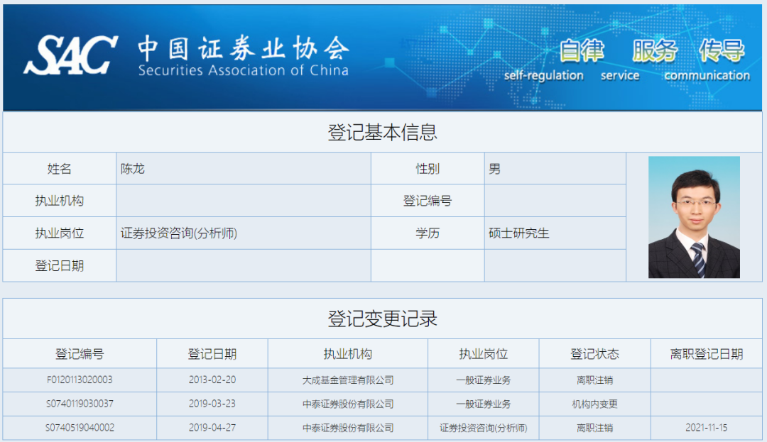 在中国证券业协会官网中,可以看到陈龙从中泰证券离职登记日期为2021年11月15日。
