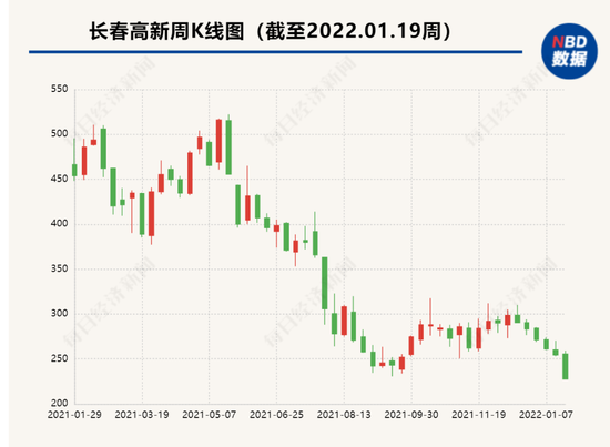 早在去年5月,市场传出生长激素集采的消息,长春高新股价从550多元的历史高位大幅走低,且消息传出的5月24日当天跌停。去年7月份,广东省公布集采药品名单,生长激素未进入,长春高新股价小幅反弹。从去年5月传出集采消息后,长春高新的股价已腰斩,市值从2000多亿,跌至最新的不足千亿。