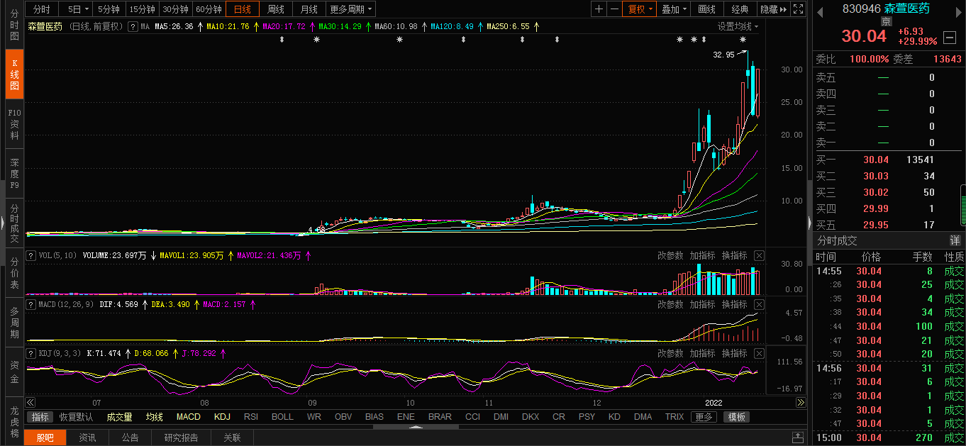 个股方面,得利斯6连板领涨,昨日上演“地天板”的中农联合继续涨停,金财互联收T字板。创业板零点有数3连板,北交所森萱医药昨日收跌20%,今日反包涨停;精华制药昨日爆量超38亿,今日缩量反包板。