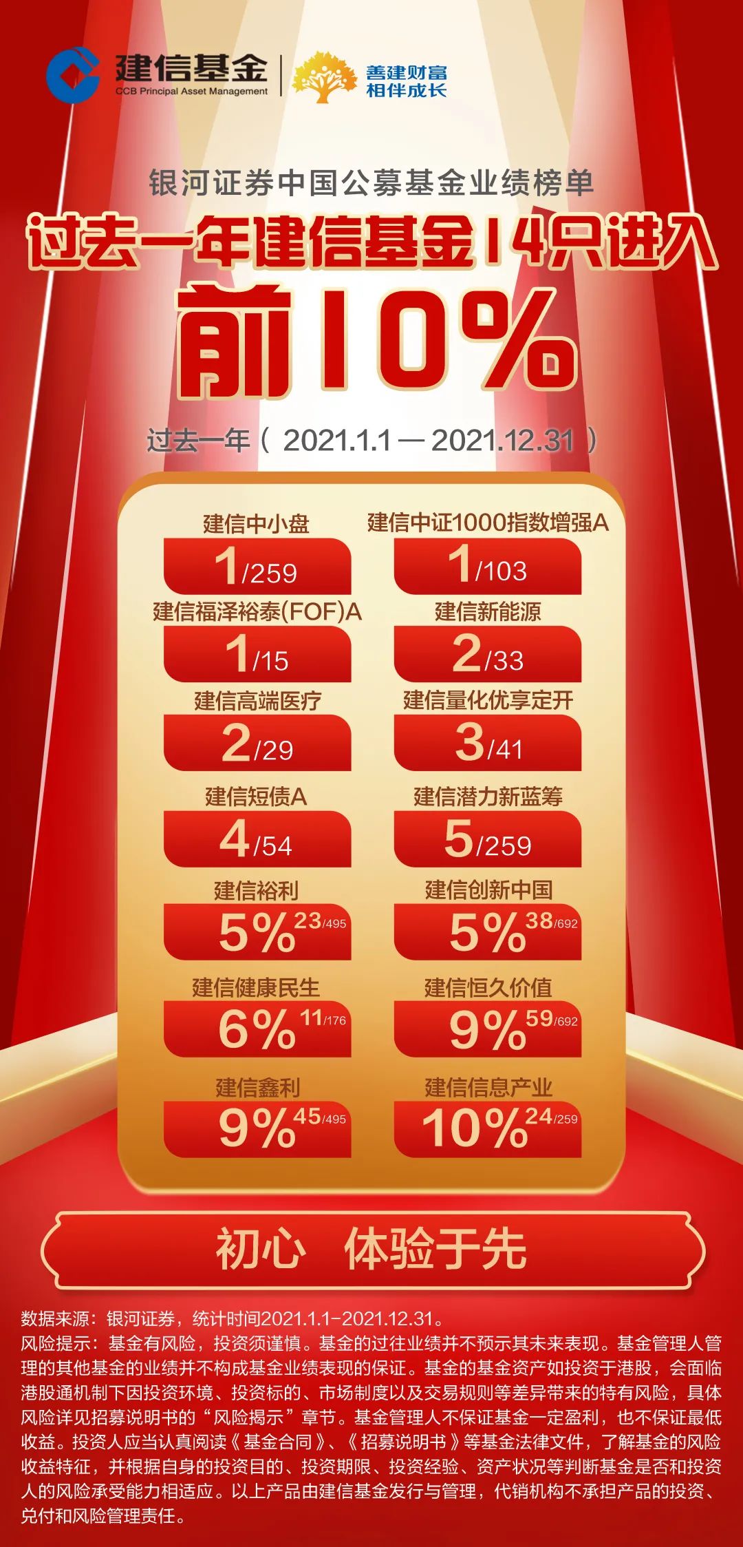 一举包揽三只“冠军基”。银河证券数据显示,建信中小盘先锋股票基金、建信中证1000指数增强基金、建信福泽裕泰混合FOF2021年投资业绩,分别在259只标准股票型基金(A类)、103只增强规模指数股票型基金(A类)、15只混合型FOF中摘得第1名。