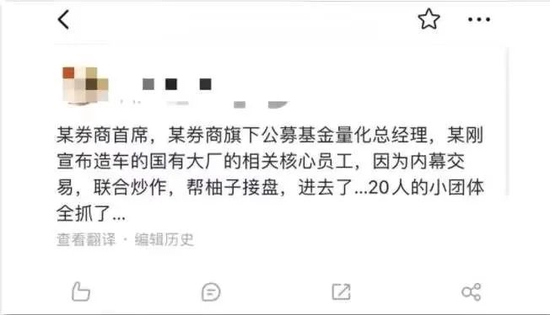 早在去年5月,前私募冠军叶飞就曾在微博爆料多家上市公司及券商参与市值管理。再至本月,恒帅股份事件发生之前,“某券商前首席策略分析师涉嫌内幕交易被抓”事件也曾引发热议。
