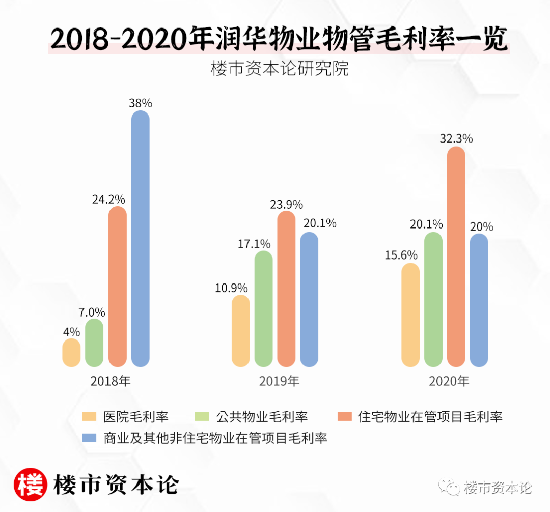 略有不同的是,定位于医院及公共板块的服务供货商的润华物业,2020财年,润华物业共有30家在管医院、95个在管公共物业;并且物业管理服务中,医院和公共物业营收占比颇高,达到总营收的29.8%和30.9%。