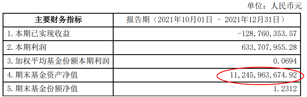 截至去年底,这只封闭型基金资产净值规模为112.46亿元,环比略增6.34亿元,增幅约为6%。四季度净值上涨5.96%,跑赢业绩比较基准。
