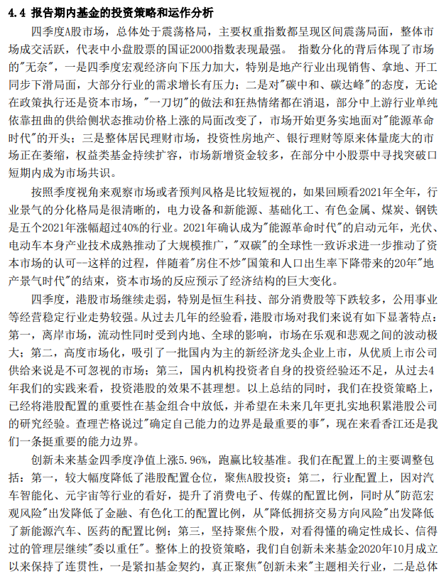 “四季度我们继续深化团队合作的工作模式,创新未来团队的两位年轻基金经理发挥了更大作用,承担了很大部分的行业和个股跟踪研究工作。未来几个月的基金管理中,我们会继续发挥团队协作,力争取得更好业绩。”他写道。