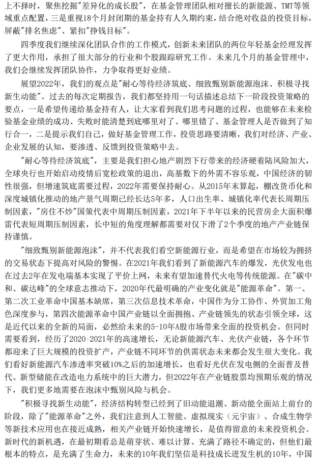 针对新一年的投资策略,周应波也用一定篇幅进行了阐述。展望2022年,他表示,“我们的观点是‘耐心等待经济筑底、细致甄别新能源泡沫、积极寻找新生动能’。”以下是他在季报中写到的内容。