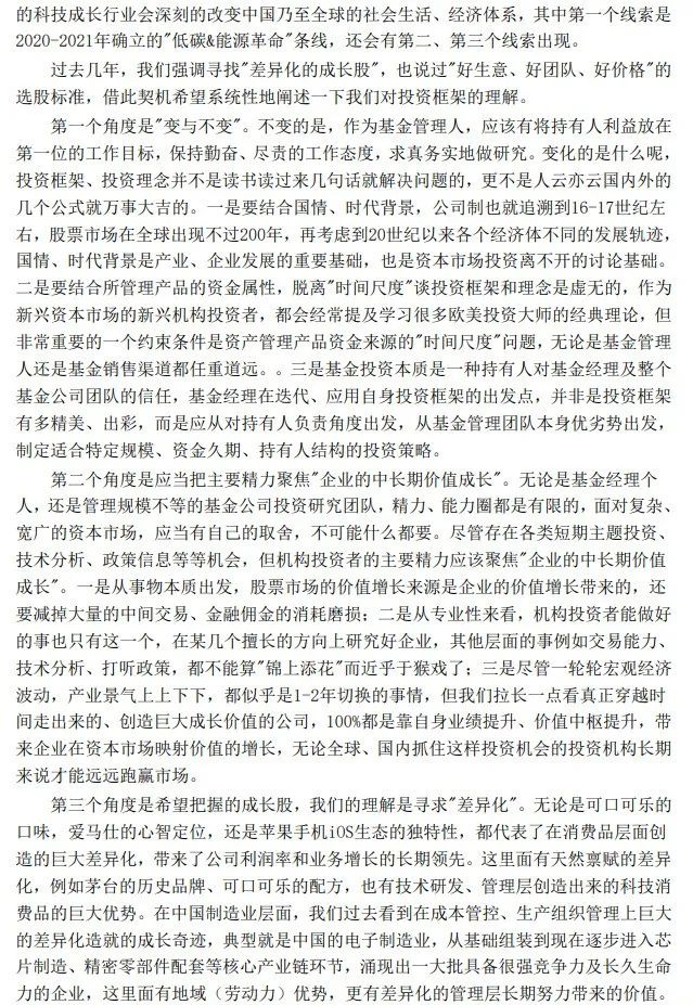 展望未来,中国资本市场具备核心竞争力、能够内生持续价值成长的公司越来越多,这是我们做好成长股投资的基础。我们希望能够继续求真务实,在长期看好的新能源、TMT、高端制造业、医药创新中寻找好的“差异化成长股”,为投资者创造回报。