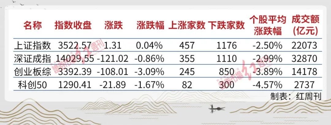 本周A股市场延续弱势形态。这一周,上证指数前二天快速反弹,后三天震荡回落,从起点发起攻势但最终又折回到起点,一周上涨1点,涨幅0.04%。深成指周跌幅0.86%,科创板跌幅1.67%,创业板综指周跌幅高达3.09%。