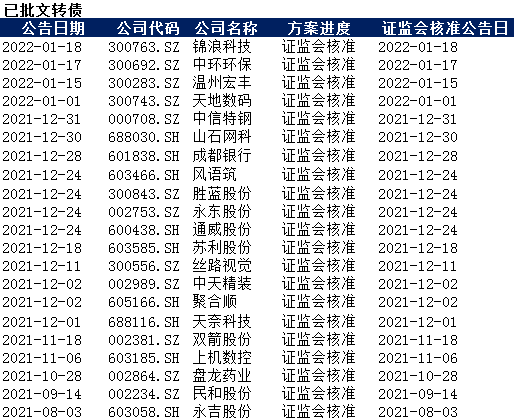 行业上来看,本周金融板块上涨,由于金融转债权重较大,对转债整体表现有一定支撑。而传媒包括元宇宙板块,相关题材的转债成交量非常大,也有较好的涨幅,但与正股走势背离,可以看出转债价格上涨主要来自于交易上的投机。本周汽车板块走势继续较弱,前期强势的医药版块也出现回调,消费表现相对平稳,各行业分化及切换依旧很大。