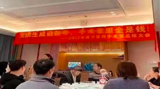 1月26日,一张有关康华医院人员聚餐的图片在网络上流传,图片显示,东莞康华医院手术室举行2022年终总结大会,会场悬挂的条幅内容为“虎虎生威迎新年,手术室里全是钱!”