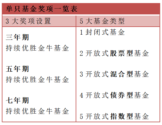 涉及单只基金的奖项分为 “七年期持续优胜金牛基金” 、“五年期持续优胜金牛基金” 、“三年期持续优胜金牛基金”,涉及五大基金类型的评选。