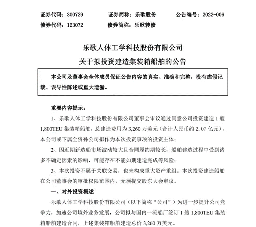 之所以斥巨资造船,乐歌股份给出的理由是:加强供应链安全、提升供应链效率,降低运输成本。乐歌股份表示,自2020年以来,全球新冠疫情持续蔓延,海外各国港口效率普遍低下,供应链安全性、及时性、可靠性和经济性受到严峻挑战。当前,消费品电商线上消费趋势持续加强,公司线上业务稳健快速成长。因此,如何能进一步提升电商购物快速到货的用户体验,缩短交货周期,提升存货周转率,降低物流成本对品牌运营的扰动显得非常关键。