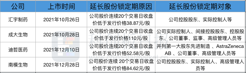 并且,以上四家医药企业发布延长股份锁定期公告均是在科创板上市后一个月左右,意味着几家公司上市后几乎就是一路破发。其中,成大生物、迪哲医药和南模生物三家是上市首日即破发,汇宇制药是上市次日破发。