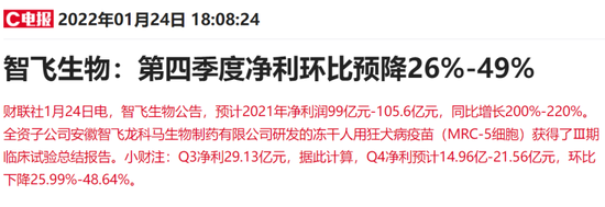 1月24日晚间,智飞生物年报预告出炉,公告预计2021年净利润99亿元-105.6亿元,同比增长200%-220%。Q3净利29.13亿元,据此计算,Q4净利预计14.96亿-21.56亿元,环比下降25.99%-48.64%。