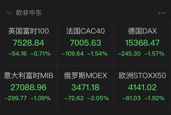 欧洲股市方面,主要股指全线下跌。截至收盘,英国富时100指数跌54.16点,跌幅为0.71%。德国DAX30指数下跌245.30点,跌幅为1.57%。法国CAC40指数跌109.64点,跌幅为1.54%。欧洲斯托克指数跌近2%。