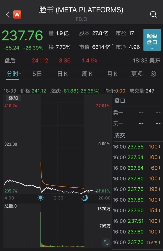 Facebook母公司Meta Platforms股价收盘暴跌26.4%,该公司在公司季度盈利低于预期,同时发布了弱于预期的本季度营收指引。