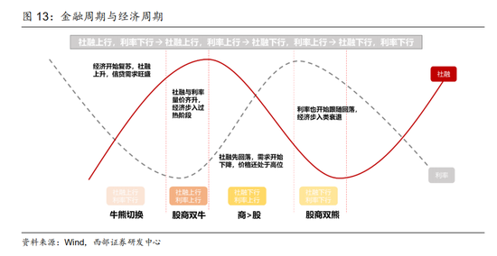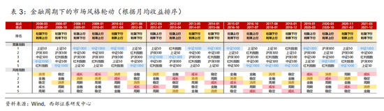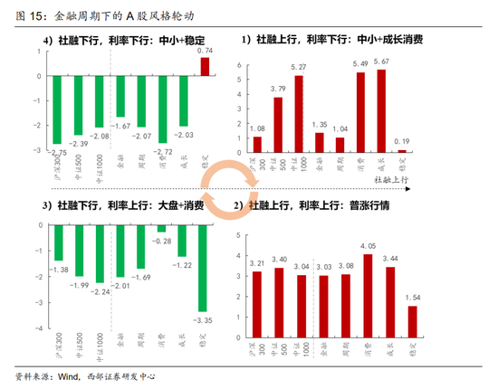 随着国内政策由宽货币到宽信用的推进,未来可以预期的宏观环境将是社融逐步企稳回升而利率震荡筑底,对应我们研究框架中的“类过热”环境。自2008年起,不同金融周期阶段大类资产与风格表现呈现出不同特征:1)类复苏:社融上行,利率下行往往对应经济触底复苏,政策转宽,股商机会开始显现,中小盘+成长消费相对更好,成长与消费风格月均回报分别达到5.67%与5.49%;2)类过热:社融上行,利率上行期间,股商双牛概率走高,A股行业普遍上涨,其中消费相对表现更胜一筹,月均回报达到4.05%,市场风格也从小盘领先转向均衡;3)类滞胀:社融下行,利率上行期间,基本面继续回暖,刺激政策退出,往往出现股熊商牛的格局,A股风格切换至大盘,消费相对抗跌;4)类衰退:社融下行,利率下行期间,往往出现股商双熊,A股仅稳定风格相对收益较好。